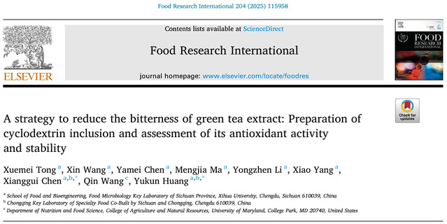 针对这一问题,课题组研究提出了环糊精包合-降苦协同策略,通过β-环糊精包合技术构建GTE/β-CD包合物。电子舌检测与结构表征结果显示,该包合物有效降低了苦味,同时保持了高抗氧化活性与稳定性,为绿茶提取物在食品领域的功能化开发提供了可行路径。相关研究成果发表在中科院一区TOP期刊Food Research International(影响因子8.0),论文题为“A strategy to reduce the bitterness of green tea extract: Preparation of cyclodextrin inclusion and assessment of its antioxidant activity and stability”,西华大学硕士研究生童雪梅、王新为论文共同第一作者,陈祥贵教授、黄玉坤教授共同通讯作者,马里兰大学王芹教授共同指导。