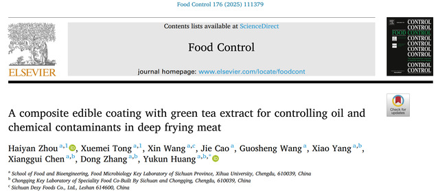 科研成果能否真正“落地”,是创新的关键。课题组进一步探索了茶叶成分在食品安全与品质提升中的应用,在中科院一区TOP期刊Food Control(影响因子6.3)发表论文“A composite edible coating with green tea extract for controlling oil and chemical contaminants in deep frying meat”研究论文(周海燕博士、童雪梅硕士研究生共同第一作者,黄玉坤教授通讯作者)。