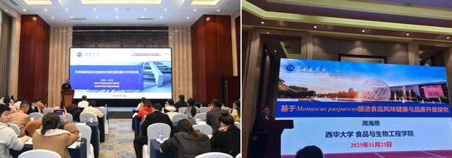 会上,张庆教授作了《传统酿造食品功能微生物资源挖掘与开发利用》专题报告,系统介绍了其在功能微生物资源开发方面的研究进展。周海燕博士以《基于Monascus purpureus酿造食品风味健康与品质升级的初步研究》为题,深入探讨了红曲霉在提升酿造食品风味与营养品质方面的应用潜力。