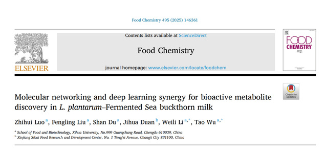 近日,西华大学食品与生物工程学院吴韬教授团队在食品领域TOP期刊 《Food Chemistry》 (Q1,IF: 9.8)发表题为“Molecular networking and deep learning synergy for bioactive metabolite discovery in L. plantarum–Fermented Sea buckthorn milk”的研究论文。食品与生物工程学院2022级农业专业硕士研究生罗智慧为第一作者,西华大学食品与生物工程学院李伟丽教授和吴韬教授为本文的共同通讯作者。
