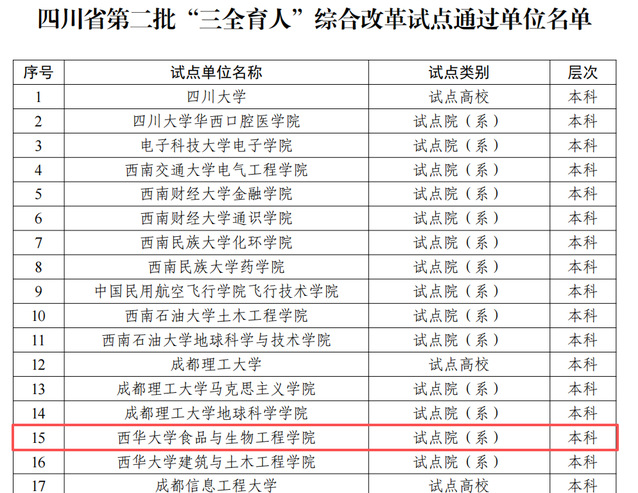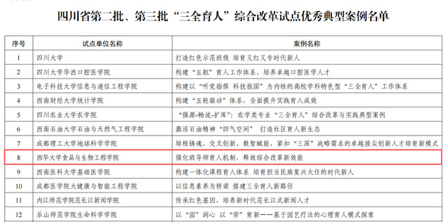 近日,中共四川省委教育工委办公室发布《中共四川省委教育工委办公室关于公布第二批、第三批“三全育人”综合改革试点总结评审结果的通知》(川教工委办函〔2025〕7号),食品与生物工程学院作为第二批“三全育人”综合改革试点院(系)顺利通过总结评审,学院提交的案例《强化班导师育人机制,释放综合改革新效能》获评“综合改革试点优秀典型案例”,为我院立德树人工作再添标志性成果。