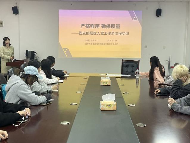 为深入学习贯彻习近平新时代中国特色社会主义思想和党的二十大精神,落实党建带团建要求,规范团支部“推优入党”工作,提升“推优入党”工作的规范性与实效性,保证党员发展质量,同时,提高团干部业务能力,扎实团干部业务知识,2026年3月4日17:00,食品与生物工程学院党委在5D419会议室举办了“严格程序,确保质量——团支部推优入党工作全流程实训”专题培训。