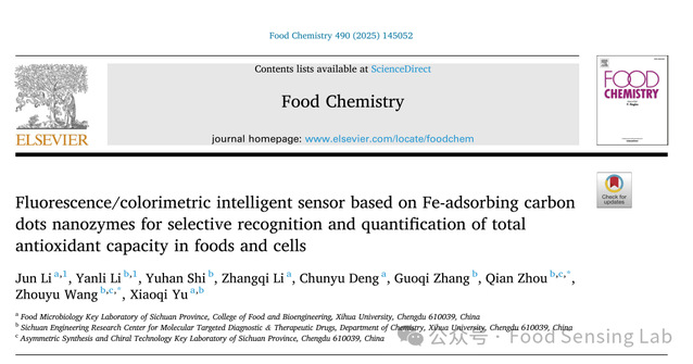 西华大学食品与生物工程学院食品营养与安全团队李军老师在食品领域TOP期刊《Food Chemistry》(Q1,IF: 9.8)上发表了题为“Fluorescence/colorimetric intelligent sensor based on Fe-adsorbing carbon dots nanozymes for selective recognition and quantification of total antioxidant capacity in foods and cells”的研究论文。西华大学食品与生物工程学院教师李军为第一作者,研究生李艳丽为共同第一作者,西华大学理学院周倩副教授和王周玉教授为本文的通讯作者。