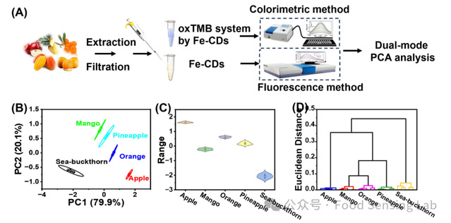 Fig. 4. (A) Schematics of TAC recognition of various fruit juice based on fluorescence/colorimetric sensor array. (B) 2D canonical score plots of the sensor array toward 5 fruit juice samples. (C) Plot of the PC1 and (D) SCA dendrogram vs 5 fruit juice samples, respectively.