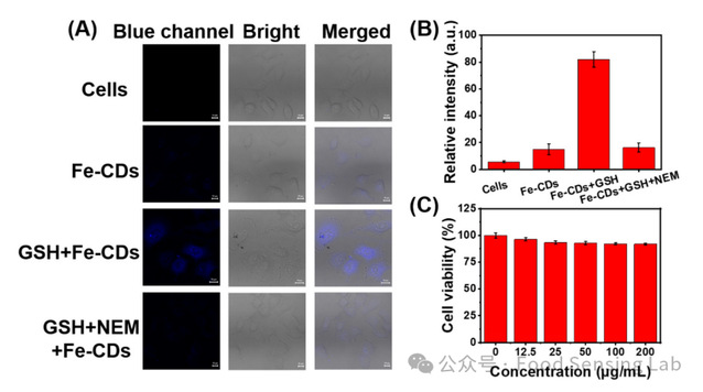 Fig. 6. (A) CLSM images, and (B) Relative fluorescence intensity of cells treated with Fe-CDs under conditions of additional or depletion of GSH. (C) Cell viability of HL-7702 cells treated with Fe-CDs. The scale bar was 10 μm.