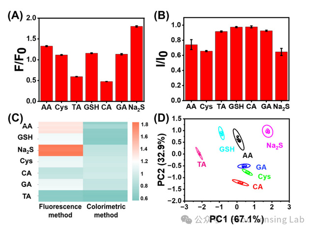 不断升级的氧化应激极大地增加了日需要量,总抗氧化能力(TAC)已成为重要的指标。因此,开发有效的TAC评价方法一直是研究热点。本文通过合理设计构建了一种基于Fe-CDs的荧光/比色传感器。基于铁吸附的策略将碳点的荧光猝灭,并通过添加抗氧化剂使其恢复,从而实现荧光检测。此外,该策略还赋予了Fe-CDs实现比色检测所必需的过氧化物酶(POD)活性。随后,作者构建了一种基于Fe-CDs的双模荧光/比色传感器阵列,对7种抗氧化剂进行了选择性识别,并对5种实际样品的TAC进行了准确评价。此外,Fe-CDs荧光/比色法检测果汁中抗坏血酸TAC具有良好的准确性和抗干扰性,检出限分别为2.1 μM和0.4 μM,线性范围分别为4 ~ 40 μM和6.3 ~ 150 μM。此外,Fe-CDs还可以通过荧光成像引导了细胞水平的谷胱甘肽含量的变化