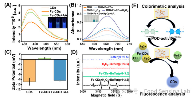 Fig. 2. (A) Fluorescence enhancement curve and (C) Zeta potential of Fe-CDs before and after adding AA, (B) UV–vis absorption spectrum in oxTMB system of Fe-CDs before and after adding AA, (D) ESR spectrum of Fe-CDs under different condition, and (E) Schematic diagram of the mechanism of Fe-CDs for detecting antioxidants through fluorescence/colorimetric analysis, respectively. Inset was the corresponding photographs.