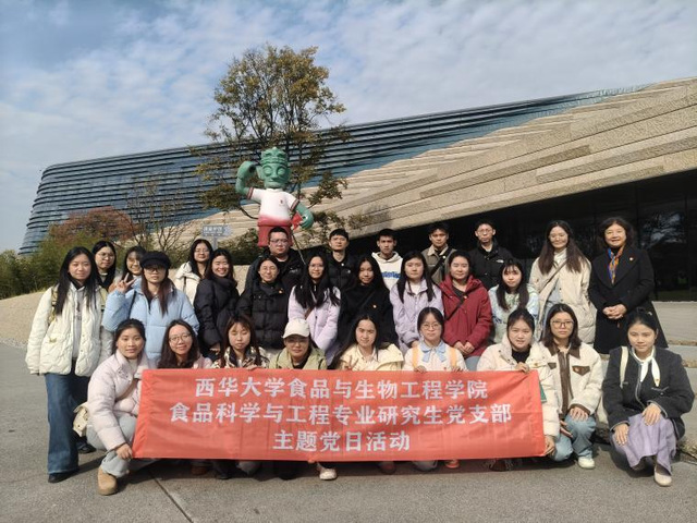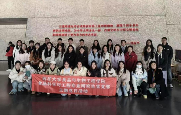 为深入学习贯彻习近平总书记重要指示精神,坚定文化自信、厚植文化情怀,西华大学食品与生物工程学院食品科学与工程专业研究生党支部于2025年11月23日组织全体党员前往广汉三星堆博物馆,开展“坚定文化自信,勇担时代使命”主题党日活动。此次活动旨在走进三星堆博物馆,于古蜀文明中寻根溯源,于文化传承中坚定信仰,激励学生党员们在新时代勇担时代使命,为中华民族伟大复兴砥砺前行。