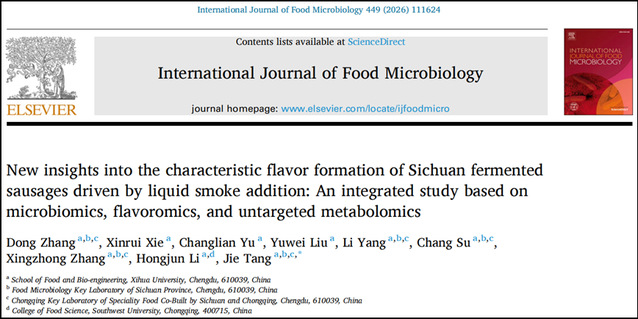 近期,西华大学食品与生物工程学院张东副教授在《International Journal of Food Microbiology》(国际食品微生物学杂志1区,IF=5.2)发表了题为“New insights into the characteristic flavor formation of Sichuan fermented sausages driven by liquid smoke addition: An integrated study based on microbiomics, flavoromics, and untargeted metabolomics”的研究性论文。