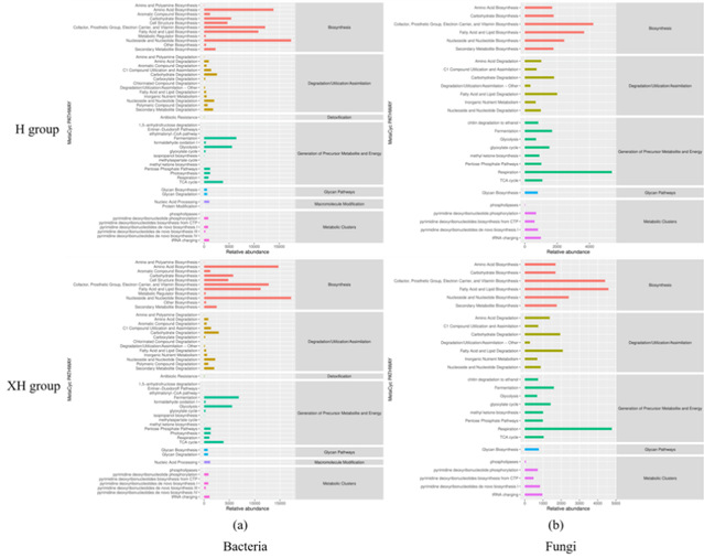图4 H组与XH组川式发酵香肠中基于细菌(a)和真菌(b)预测的MetaCyc二级功能通路丰度图
