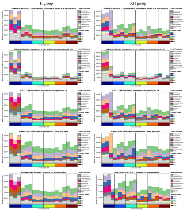 图5 H组和XH组川式香肠发酵过程中细菌贡献的差异性MetaCyc代谢通路物种组成图