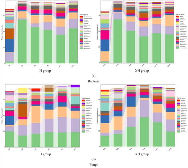 图2 H组与XH组川式香肠发酵过程中细菌(a)和真菌(b)在属水平的物种组成柱状图