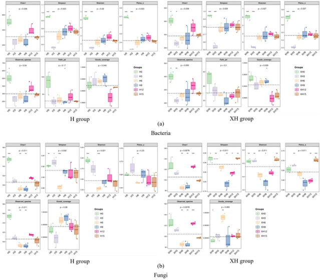 图1 H组与XH组川式香肠发酵过程中细菌(a)和真菌(b)的α多样性指数