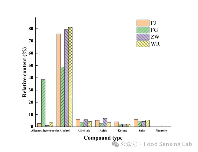 Fig. 4. Comparison results of the relative content of various types of volatile substances in superfine indica rice samples fermented by different Lactobacillus.
