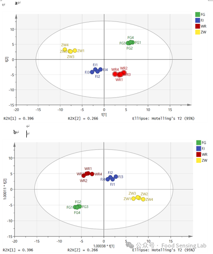 Fig. 6. Principal component analysis graph of indica rice samples fermented with different Lactobacillus a. OPLS-DA diagram of indica rice samples fermented with different Lactobacillus b.Note: “FJ” denotes fermented Lactobacillus paracasei GF1800, “FG” denotes Lactobacillus paracasei S8, “ZW” denotes Lactobacillus plantarum. “WR” means without Lactobacillus fermentum.