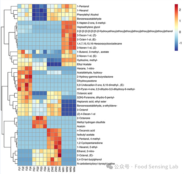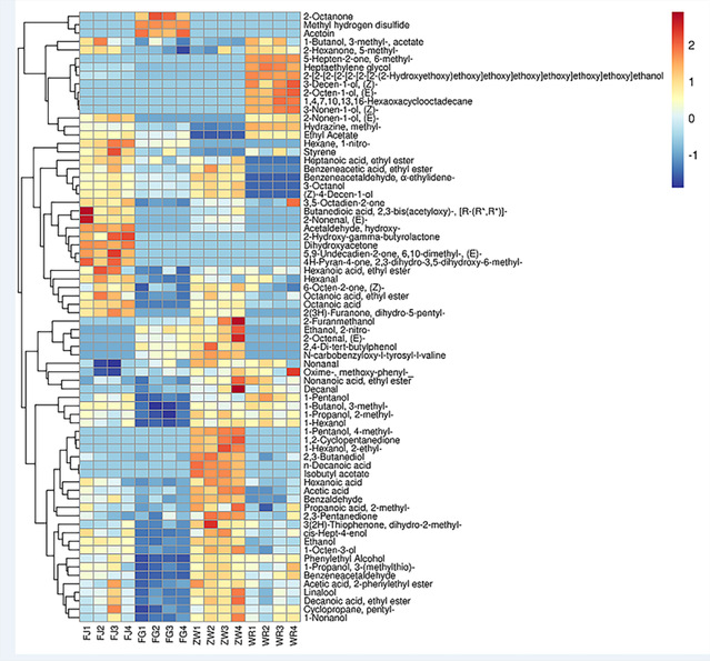 Fig. 5. Heat map of volatile components of supermicro indica rice samples fermented with and without Lactobacillus Note: Red and blue colors represent above and below average metabolites, respectively; the redder the color, the higher the level.