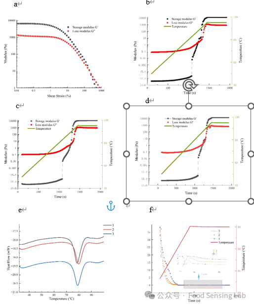 Fig. 2. Changes of storage energy and loss modulus of superfine indica rice flour when the logarithm of strain changes a.b, c, and d are the dynamic viscoelasticity diagrams of No. 1, No. 2, and No. 3 supermicro indica rice samples, respectively, The tand diagrams of three groups of supermicro indica rice samples with different grain sizes at 83-95 ℃ e. Thermal characteristics of 3 groups of superfine indica rice flour with different particle sizes from 25 °C to 100 °C f.