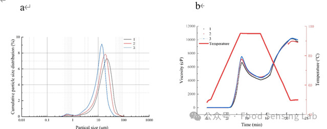 Fig. 1. The particle sizes distribution of the Superfine Indica Rice powders a,Viscosity changes of 3 groups of superfine indica rice flour samples with different particle sizes during gelatinization b.