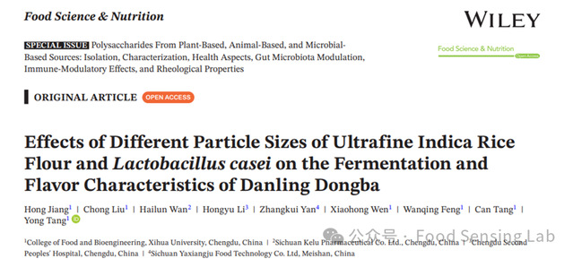 近日,西华大学食品与生物工程学院唐勇教授团队在《Food Science & Nutrition》上发表题为 “ Effects of Different Particle Sizes of Ultrafine Indica Rice Flour and Lactobacillus casei on the Fermentation and Flavor Characteristics of Danling Dongba”的论文。西华大学食品与生物工程学院2023级食品科学与工程专业研究生江虹为本文的第一作者,食品与生物工程学唐勇教授为论文的通讯作者。