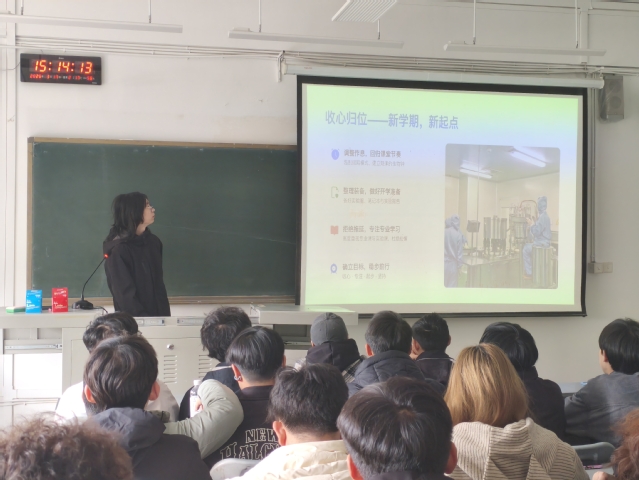 一是聚焦情绪调节,助力“心适应”。各班通过“心情温度计”、匿名小调查等互动形式,引导同学们坦诚分享开学初的情绪体验。班会上,同学们认识到焦虑、期待、不舍等情绪都是适应期的正常反应,关键在于主动调适。通过讲解“成长型思维”,鼓励大家将挑战视为发展机遇,从小目标起步,逐步建立新学期节奏,并学会在需要时主动寻求支持、积蓄能量。二是强化学业规划,明确“未来路”。各班以“收心聚力,规划未来”为切入点,结合专业特点与发展路径,帮助同学们强化身份认同、树立学业目标。班会详细梳理了专业课程体系与就业方向,分析考研、就业、出国等不同选择,引导同学们尽早规划、扎实积累。特别强调大二阶段在学业、实验、英语等方面打好基础的重要性,鼓励同学们以专注踏实的态度,为长远发展做好准备。三是普及心理知识,推动“知行合一”。在各班班会中,均围绕大学生常见心理议题展开交流,如压力应对、人际交往、自我认知等。班会传递了“心理健康不是没有困扰,而是能够与情绪共处、保持生活平衡”的理念,并介绍了如正念呼吸、时间管理、积极暗示等易于操作的心理调适技巧。同学们在互动中增强了关注心理健康的意识,也掌握了具体可用的自助方法。